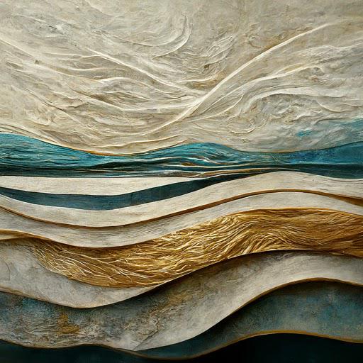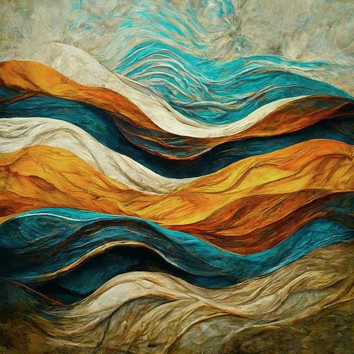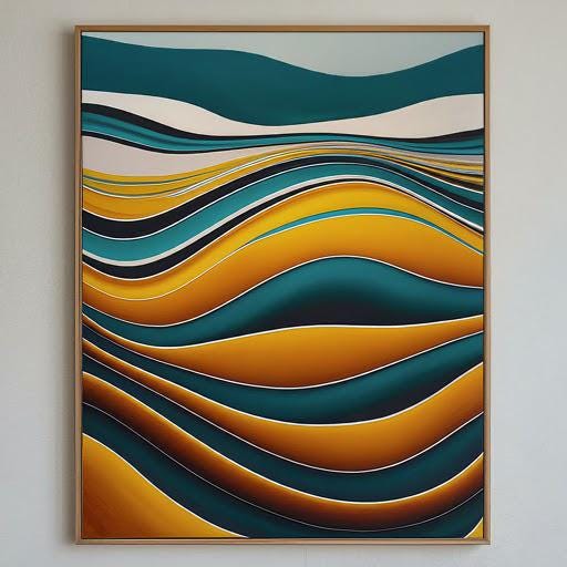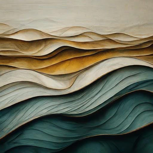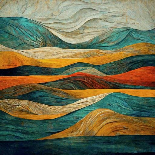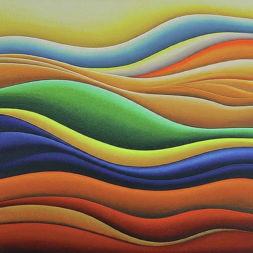 The colors are warm and earthy—shades of orange, rust, red, and yellow—balanced with cool tones like teal, blue, and muted green. These bands resemble rolling hills, waves, or geological layers, creating a sense of depth and movement.